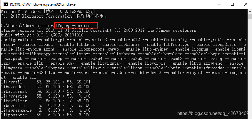 cmd中输入 ffmpeg -version,出现如下信息则配置成功