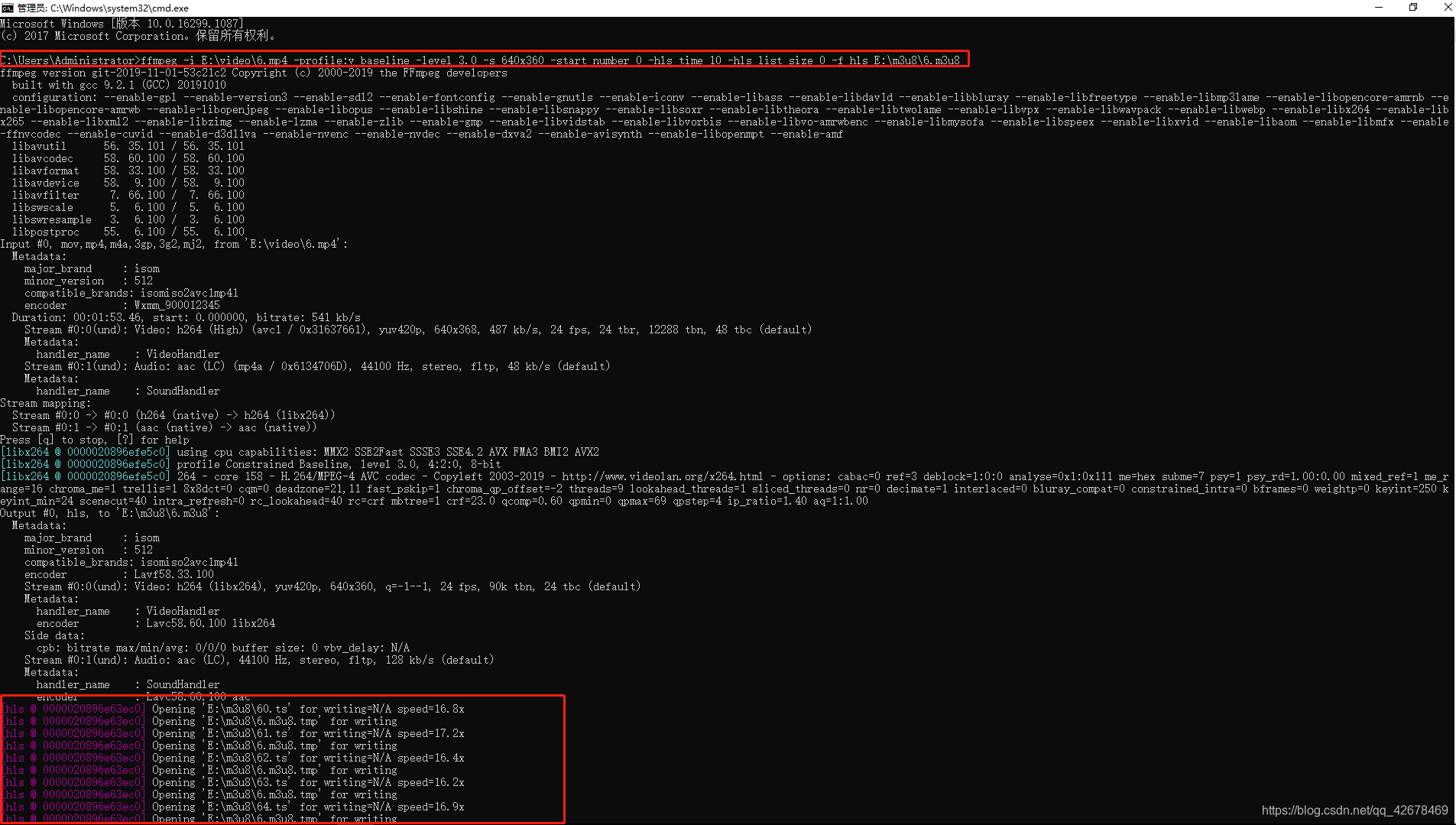 ffmpeg -i E:\video\6.mp4 -profile:v baseline -level 3.0 -s 640x360 -start_number 0 -hls_time 10 -hls_list_size 0 -f hls E:\m3u8\6.m3u8
