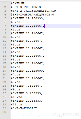 转换后会生成ts文件,使用notpad++打开6.m3u8文件之后会看到如下,这里就是视频每一段的地址,在播放完上一段之后会自动加载下一段,把一个大的视频文件按照一定大小或时长把一个视频分为N段播放,这样的优势是打开视频加载速度快,可以达到秒播