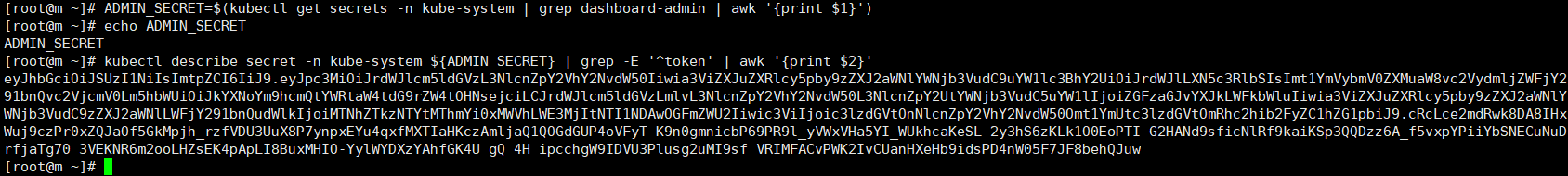 kubectl describe secret -n kube-system ${ADMIN_SECRET} | grep -E '^token' | awk '{print $2}'
