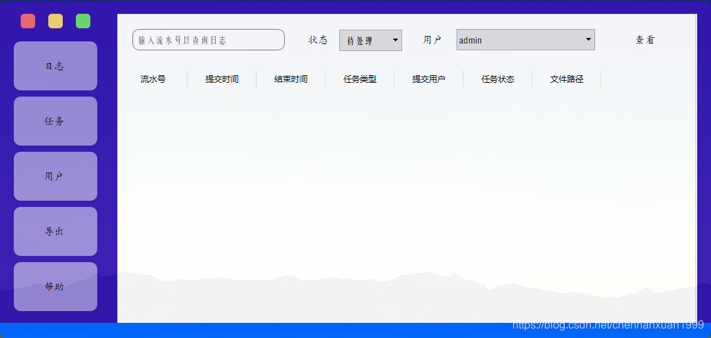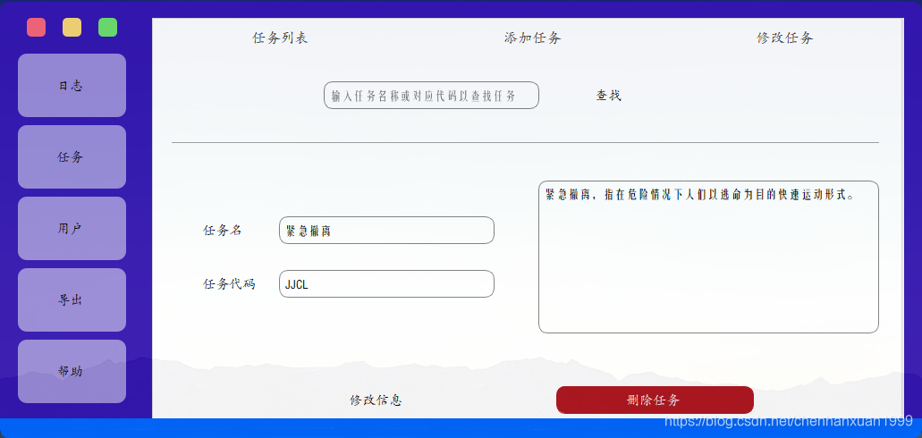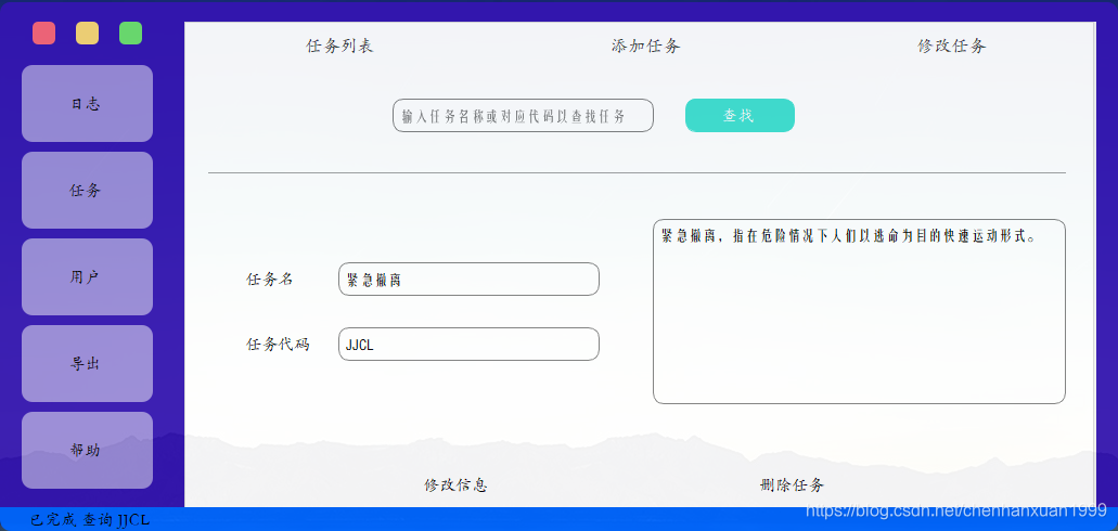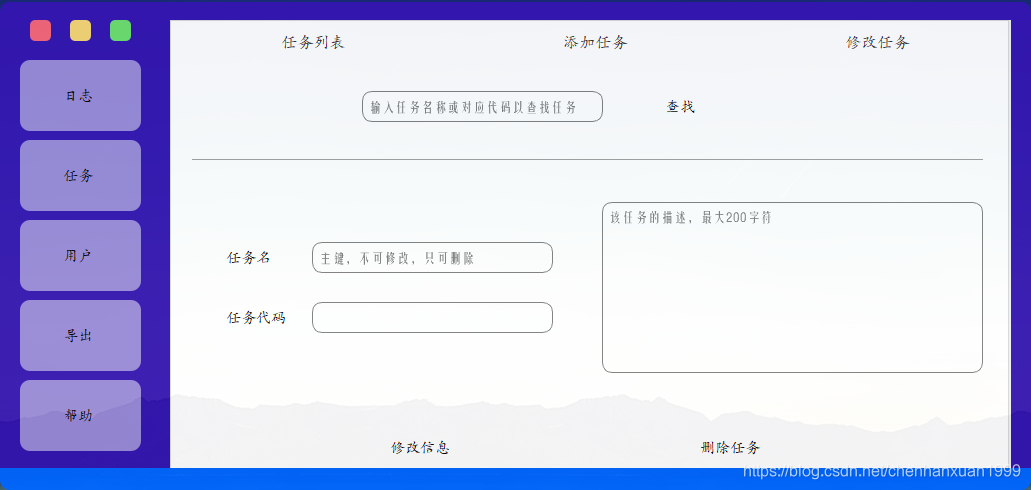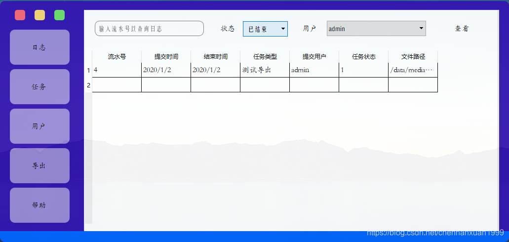 带账号登录,数据库校验,数据库操作,数据Excel导出。联网rpyc模块是独立的,不放进来。1.登录界面登录成功后跳转到日志界面。2.日志界面支持搜索框直接查询;过滤器查询查询结果展示:3.任务管理输入两个键值中的任意一个进行查询,之后自动填充下面的任务名,任务代码,任务描述。接下来可以修改信息或者删除任务。查询+自动填充示例:...