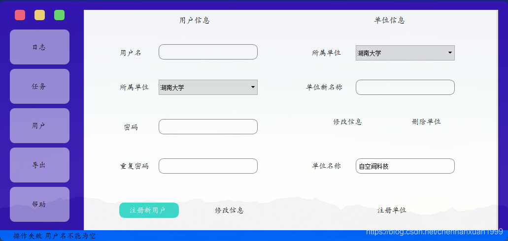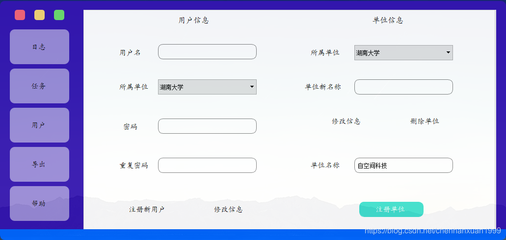提供完善的用户信息修改,单位注册,下拉框均通过代码动态刷新读取数据库中内容,并做了细致的异常处理。