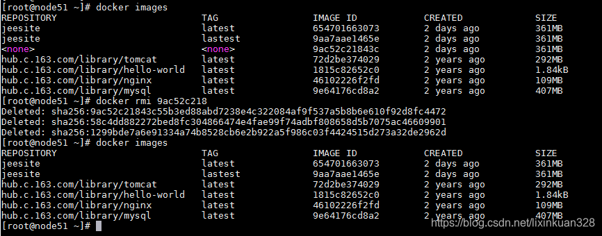 注:在移除镜像之前要确保该镜像下没有容器了(包括已经停止的容器),否则该镜像无法进行删除,先要使用docker rm删除该镜像下所有的容器之后才能移除该镜像。