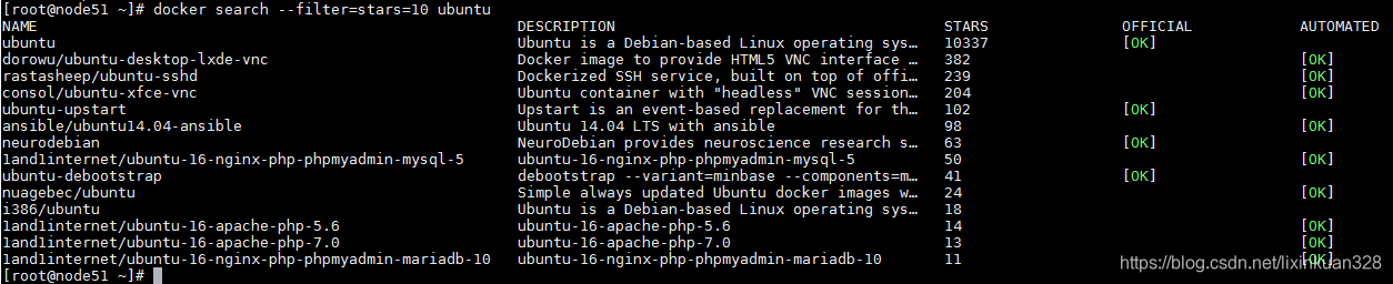 docker search --filter=stars=10 ubuntu (限制星数为10,或者简写: docker search -f=stars=10 ubuntu)