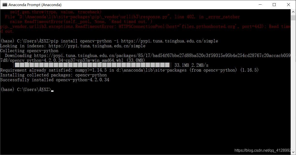 输入:pip install opencv-python -i https://pypi.tuna.tsinghua.edu.cn/simple