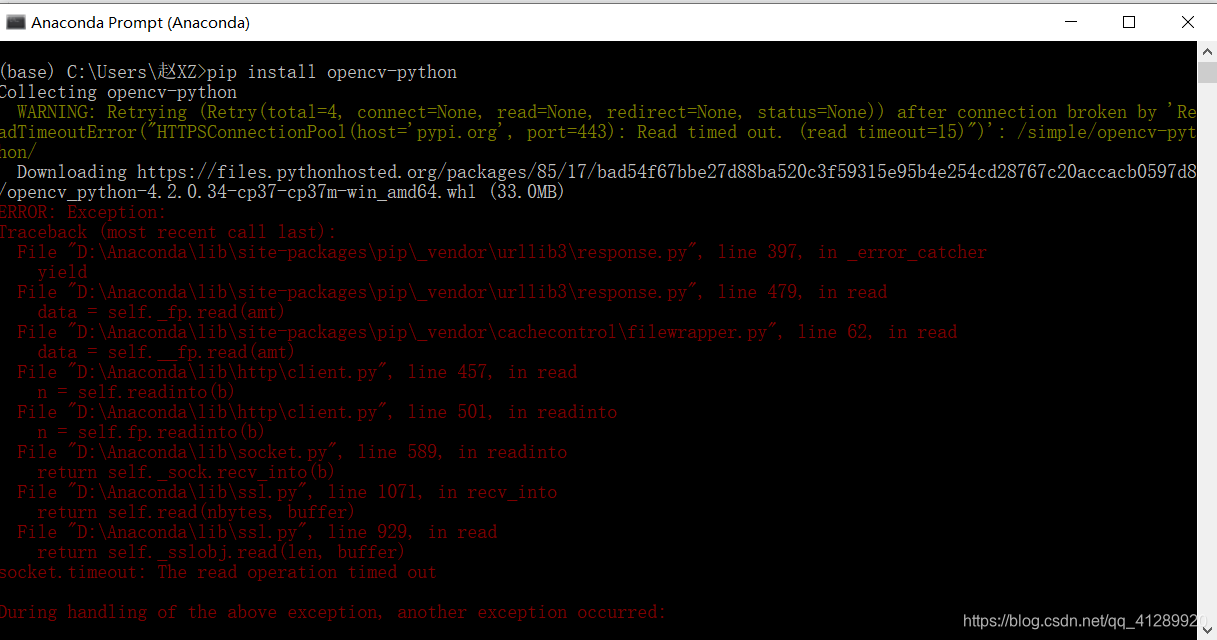 自己找一个opencv的whl版本,下载下来,然后pip install 你下载的文件.whl,就可以了。最后import cv2能够成功。