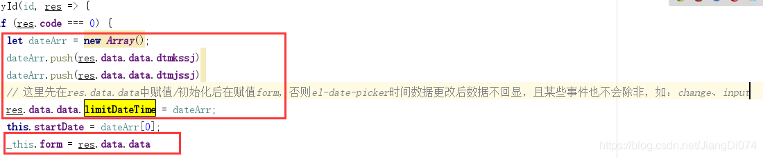 于是,开始愚蠢式操作:把当前页面的其他无关代码全部注释,只留 el-date-picker日期,这时它一切都表现正常,然后开始一行一行放开之前注释的代码,最后定位到问题出现在哪了——原因是因为我在给el-date-picker初始化赋值之前,优先赋值了form表单(el-date-picker也在form表单中),后在组装的数据更新form表单中的el-date-picker字段,导致el-date-picker日期控件事件失效,后续操作数据不回显。