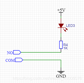 从上图可知,给继电器模块供电后,红色LED灯就会被点亮,当给IO引脚输入底电平后,单片机IO输出的电流经过S8550放大后,驱动继电器SRD-05V,继电器中5、3常闭开关断开,5、2常开开关关闭,同时绿色LED灯点亮,P1端口引脚2为COM端口,1为NC,3为NO。
