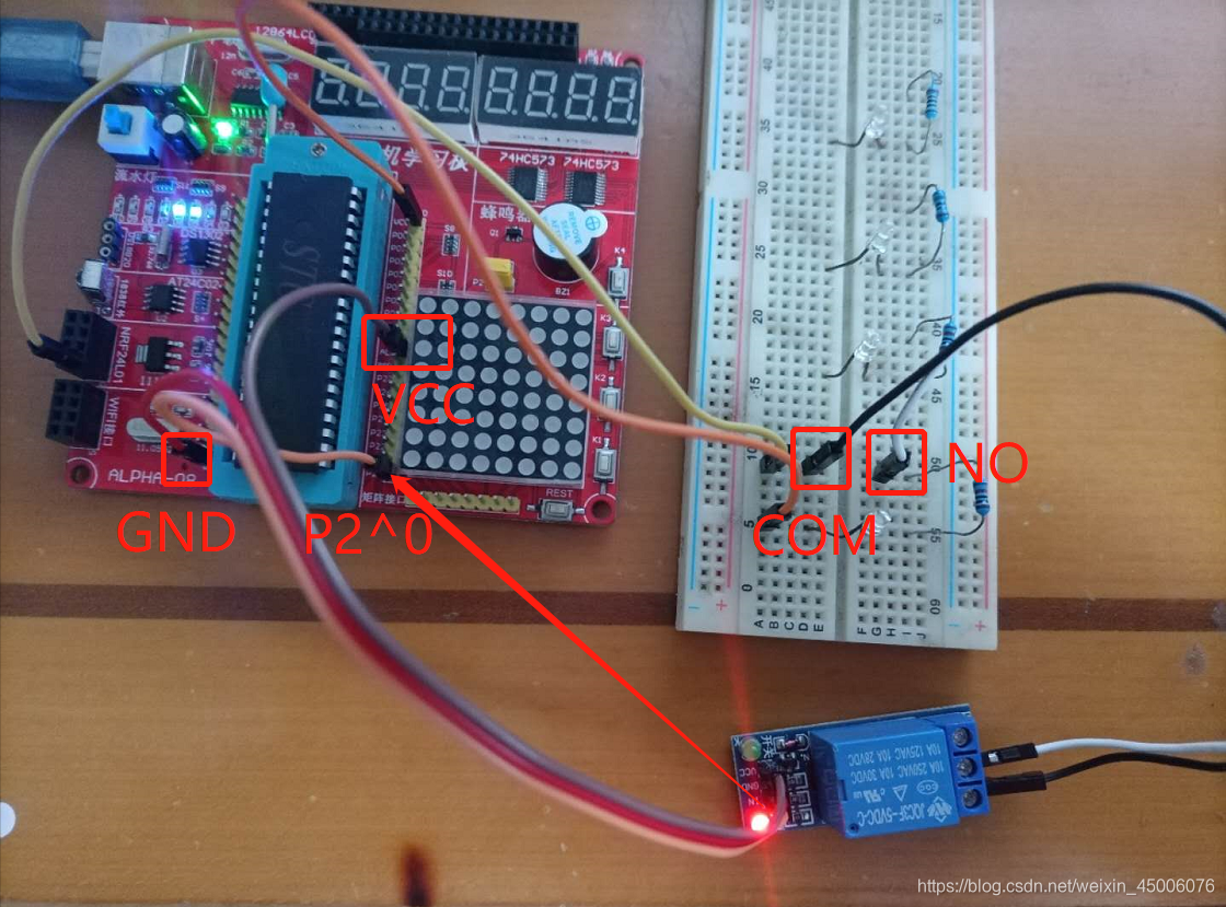 其中,VCC GND P2^0 控制继电器输入,继电器输出需要单独提供电源,可以使用220V供电,然后回路通过继电器输出端口,分别接NO和COM端口,如此继电器输出控制相当于一个开关,可以控制输出电路的通断。
