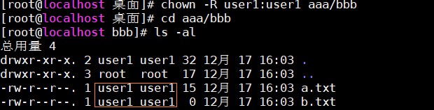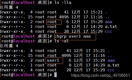 chgrp user1 aaa:将aaa的属组root改为属组user1