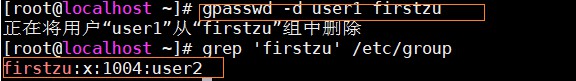 #####将用户从用户组删除:gpasswd (选项) 用户名 组名——gpasswd -d user1 firstzu