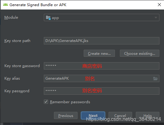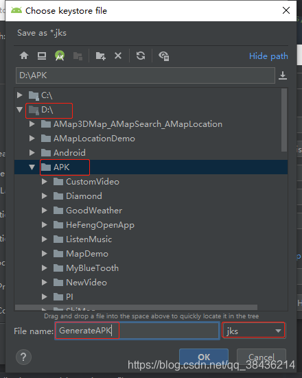 我个人习惯放在D盘的APK目录下,然后命名jks的名称为GenerateAPK,
