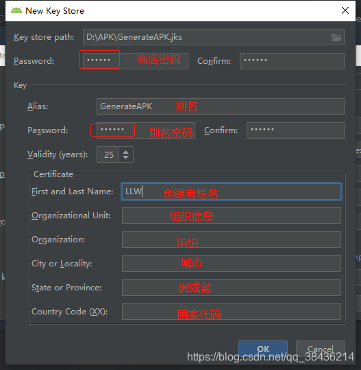然后输入这个jks和别名的一些相关信息,上方的商店密码和别名密码可以设置为一样的,这样便于记忆,只不过安全系数就降低了。我上面设置的是123456,信息都设置好了之后,点击OK。