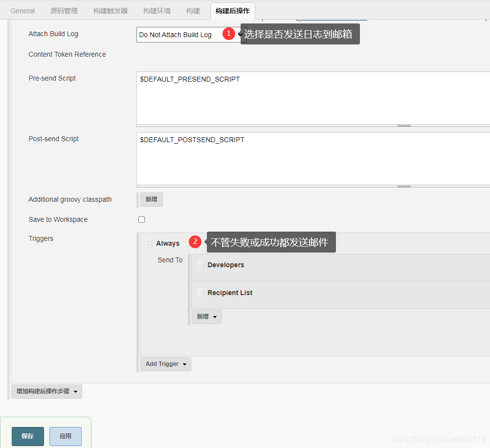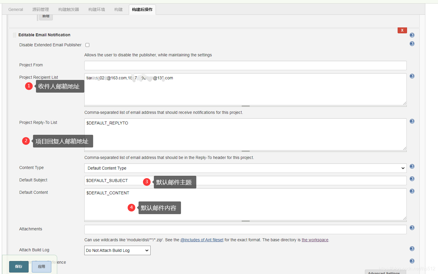 上面只是发件邮件的配置,我们还需要在项目中使用该邮件配置,具体是在构建后操作中引用。