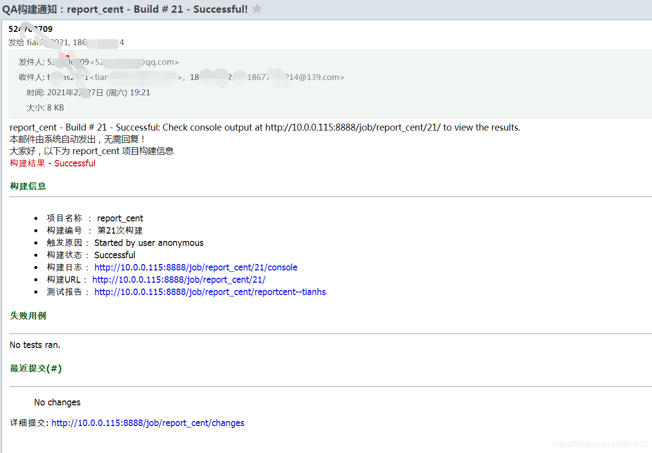 <!DOCTYPE html> <html> <head> <meta charset="UTF-8"> <title>${ENV, var="JOB_NAME"}-第${BUILD_NUMBER}次构建日志</title> </head> <body leftmargin="8" marginwidth="0" topmargin="8" marginheight="4" offset="0"> <table width="95%" cellpadding="0" cellspacing="0" style="font-size: 11pt; font-family: Tahoma, Arial, Helvetica, sans-serif"> <tr> 本邮件由系统自动发出,无需回复!<br/> 大家好,以下为 ${PROJECT_NAME } 项目构建信息</br> <td><font color="#CC0000">构建结果 - ${BUILD_STATUS}</font></td> </tr> <tr> <td><br /> <b><font color="#0B610B">构建信息</font></b> <hr size="2" width="100%" align="center" /></td> </tr> <tr> <td> <ul> <li>项目名称 : ${PROJECT_NAME}</li> <li>构建编号 : 第${BUILD_NUMBER}次构建</li> <li>触发原因: ${CAUSE}</li> <li>构建状态: ${BUILD_STATUS}</li> <li>构建日志: <a href="${BUILD_URL}console">${BUILD_URL}console</a></li> <li>构建URL: <a href="${BUILD_URL}">${BUILD_URL}</a></li> <li>测试报告: <a href="${PROJECT_URL}HTML_20Report">${PROJECT_URL}HTML_20Report</a></li> </ul> <h4><font color="#0B610B">失败用例</font></h4> <hr size="2" width="100%" /> $FAILED_TESTS<br/> <h4><font color="#0B610B">最近提交(#${GIT_REVISION})</font></h4> <hr size="2" width="100%" /> <ul> ${CHANGES_SINCE_LAST_SUCCESS, reverse=true, format="%c", changesFormat="<li>%d [%a] %m</li>"} </ul> 详细提交: <a href="${PROJECT_URL}changes">${PROJECT_URL}changes</a><br/> </td> </tr> </table> </body> </html>