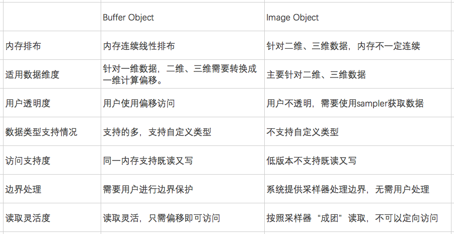 下表为OpenCL Imgae-object与Buffer-object的区别对比。