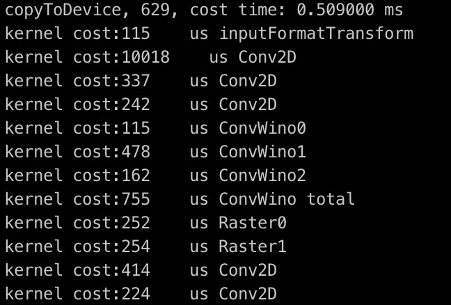 性能热点分析对于提升总体推理性能的重要性,就好比生病了去医院需要抽血分析各项指标报告一样,只有知道各处的指标详情才好对症下药。MNN GPU提供统计OpenCL kernel耗时方法,使用opencl event进行GPU端计时统计,可以精确地进行单个kernel耗时分析,准确性能明显高于CPU端计时器。