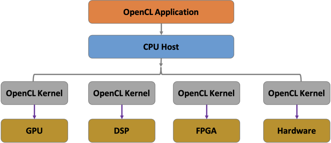 异构系统的调度,相比于同构系统调度会复杂一些,因为会涉及到主机端与设备端交互部分。下图是一个典型的OpenCL异构系统调度图。主要包含了三个部分。其一:主机CPU端,负责整个异构系统的主控调度,包括资源的申请调配、任务的发射等;其二:各种异构设备端(比如GPU/DSP/FPGA等),是异构系统的核心处理器;其三:OpenCL kernel代码,负责对异构处理器进行操纵。