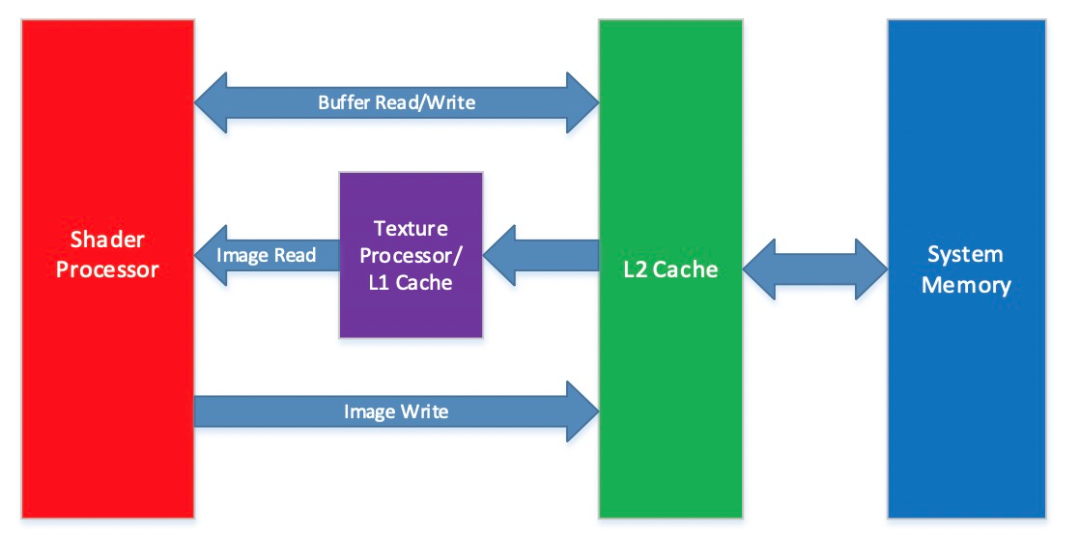 高通平台明确给出下图数据流路结构图,当使用Image-object存储时,在进去读数据时候可以使用Texture处理器和L1 cache进行快速读取。如果使用Buffer-object的话将无法使用该硬件缓存优势。所以对于高通骁龙系列手机,使用其GPU资源,选择OpenCL Image-object性能更优。