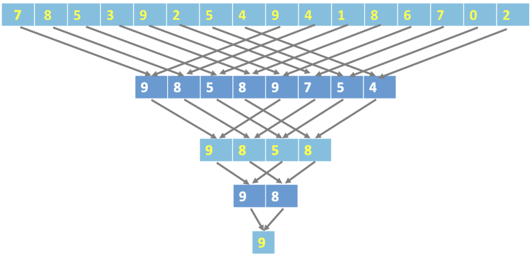 归约是一种并行算法,对于传入进来N个输入,通过二元操作,得到一个输出值。典型的就是求最值、取平均值、求和等操作。以取最大值为例,传统的串行算法,实现简单,需要N次迭代运算操作。通常如下: