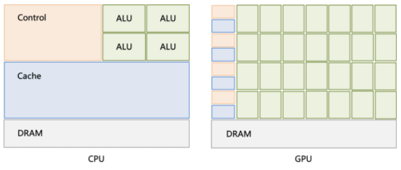 下图是CPU和GPU拥有的硬件资源(运算单元ALU/控制单元/缓存等)的示意图。
