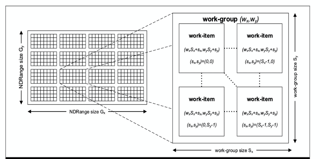 下图示意的是一个GPU任务分块执行示意图。左侧NDRange size表示的是任务拥有的总子任务(子线程)数量。子线程会被组织成一系列work-group分块线程,每个work-group分块会被分配到一个SP上面执行。这个执行过程是GPU SIMT架构的必然映射。