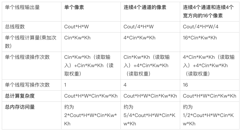 下表给出了,单个线程不同粒度计算量对应的总的计算复杂度和内存访问量大小。可以看出总的计算复杂度都是恒定的,但是随着单个线程计算量的则增加,数据可复用力度越高,总的内存访问量将会越少。拿单个像素输出粒度为基准,单个线程输出连续4个通道和连续4个宽方向的16个像素时,内存访问量将减少75%。