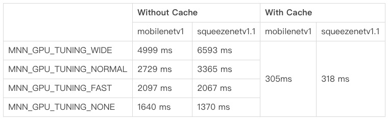 为了优化GPU初始化时间,MNN将当前机型编译好的program转成二进制、Auto-tuning出的最佳配置进行记录,并存储成Cache文件。之后初始化的时候加载Cache文件读取二进制版program(无需编译源码)和tune好的配置信息(无需再次Auto-tuning),从而大大提高初始化速度。