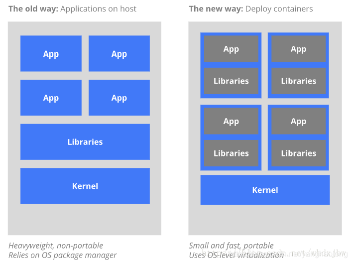 注意,大家别把这幅图与上面Docker的那张图混淆了,图1是从虚拟化角度,说明了为应用提供必要的运行环境所需要做的虚拟化操作(即:传统:虚拟出的虚拟机装操作系统、Docker:容器引擎管理下的容器)。