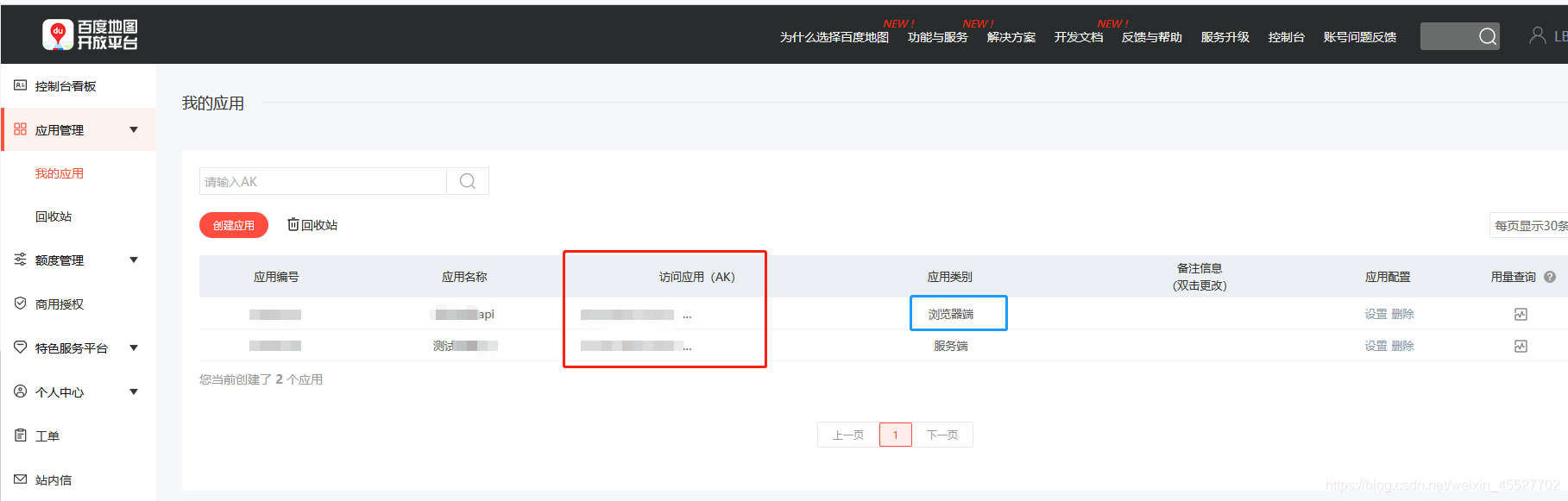红色框:代表“创建应用”成功后,ak显示的地方,在这里可以看到并复制