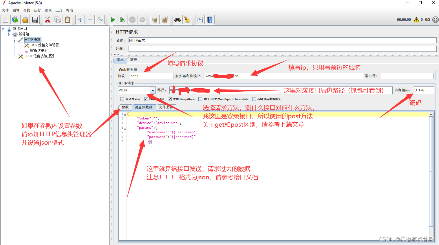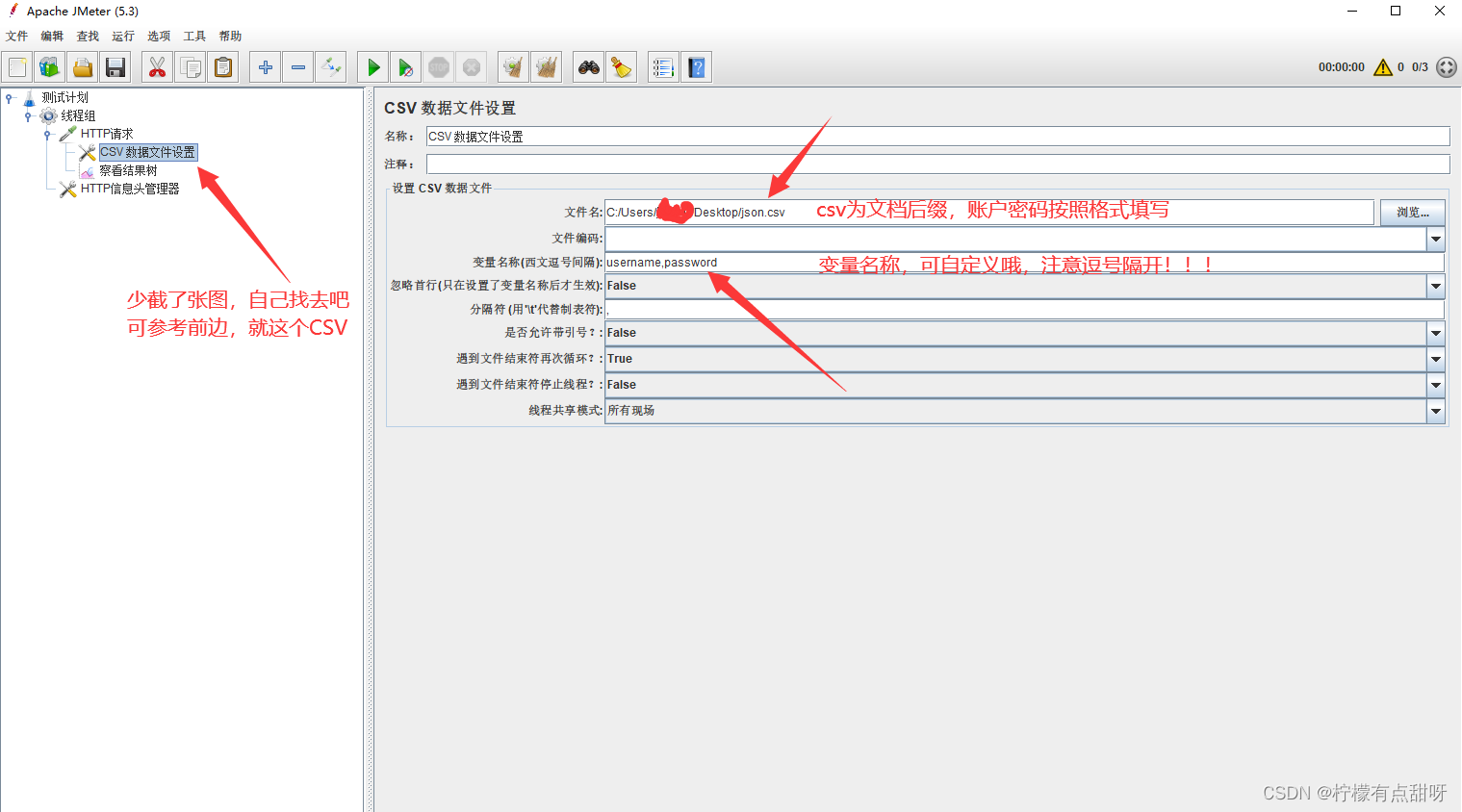 6、进阶,模拟多用户进行登录,把带账户密码的文档在jmeter里使用,注意文件格式