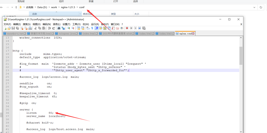 4)然后启动Nginx服务,在nginx.conf里查看index.html页面的端口(默认80端口),在浏览器访问127.0.0.1:80。