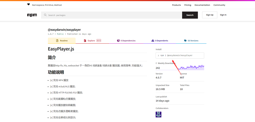 2)接着,在我们npm上下载最新的EasyPlayer。