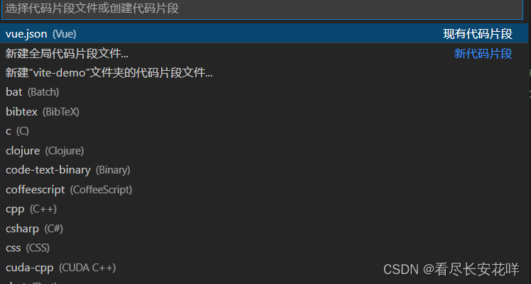 2.在弹出来的输入框中,选择第一行vue.json或者第二行新建全局代码片段文件都可,都是为了打开vue.json文件;