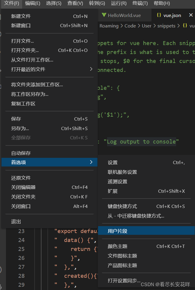 1.点击文件,再点击首选项,然后选择用户片段;2.在弹出来的输入框中,选择第一行vue.json或者第二行新建全局代码片段文件都可,都是为了打开vue.json文件;3.把下面代码复制到vue.json文件里,然后保存。{"Print to console": {"prefix": "vue","body": ["<template>","<div>\n","</di