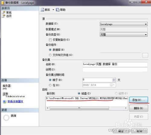***步骤1.***打开SQL server management studio, 连接到服务器,在“服务器名称”上填写本机名称,可以在计算机-右键-属性中查看“计算机名”,然后点击“连接”,如下图所示:***步骤2.***选中你要复制的数据库,右键-任务-备份,如下图所示:***步骤3.***选择你要复制的目标位置。一般情况下会有一个默认位置,请只备份到一个位置上,最好不要再添加一个位置,不然还