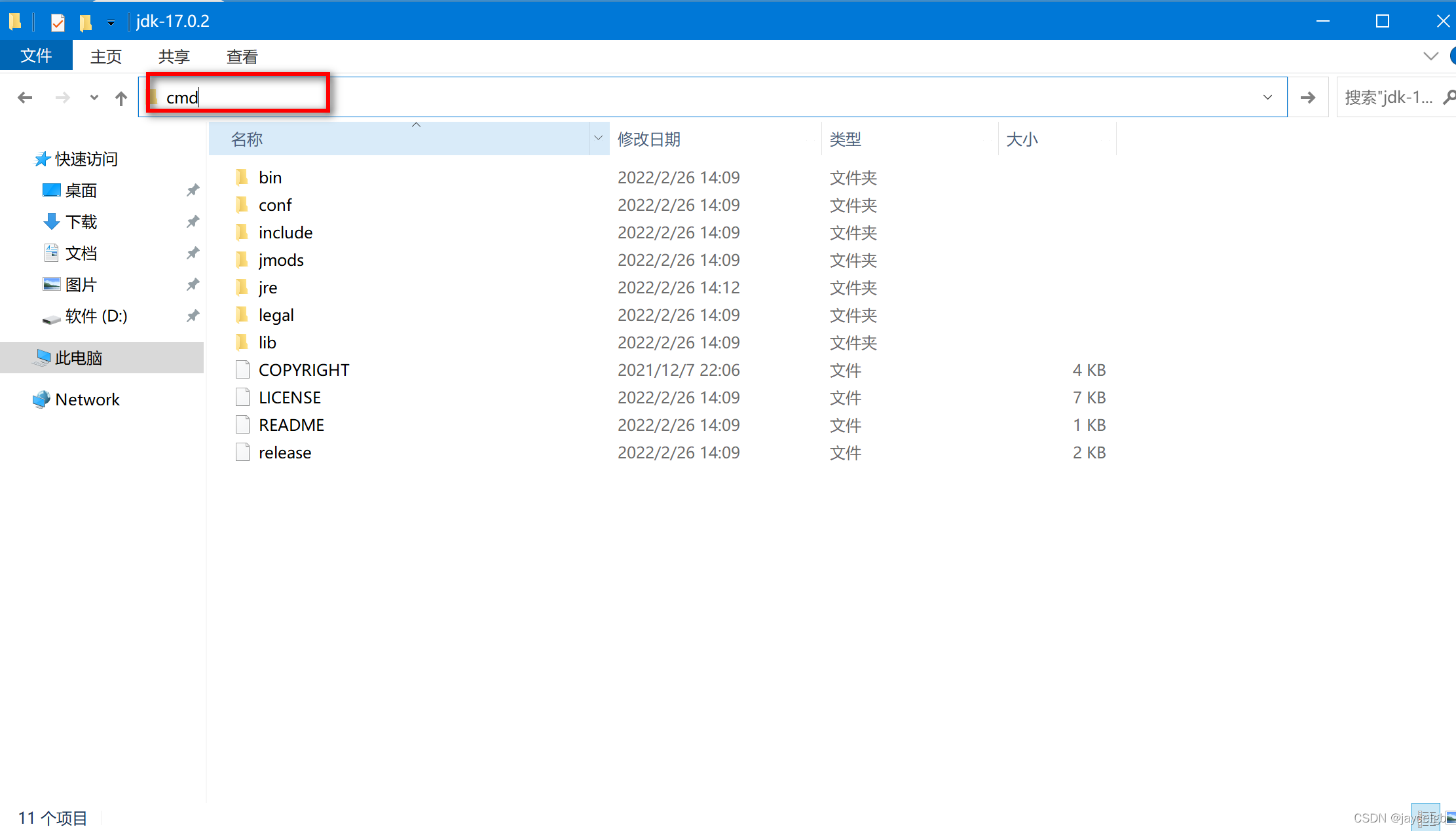 1)进入JDK安装目录,并在路径打入cmd,回车打开命令运行窗口