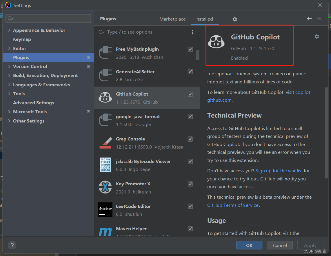 在idea插件库中安装GitHub Copilot