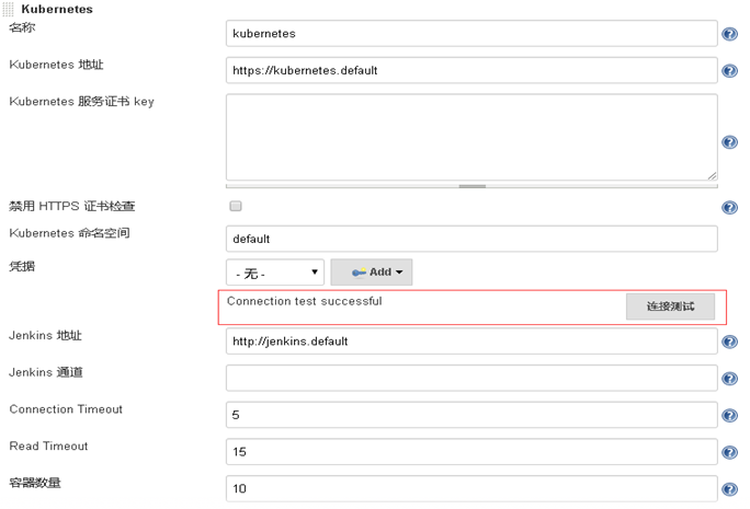 如果jenkins是直接部署在k8s之内的,就比较简单,不需要填写证书,直接这样,如图: