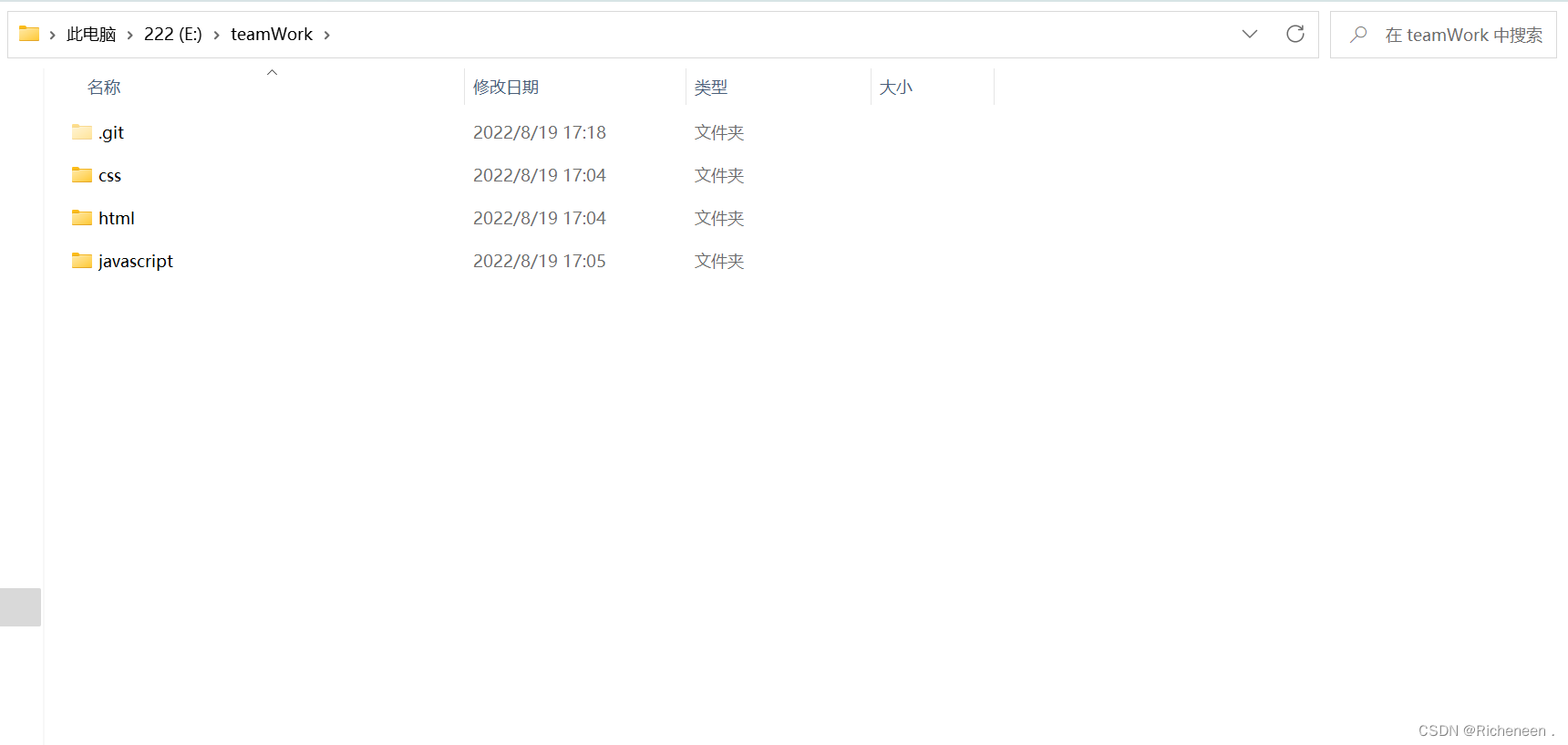 紧接着把在本地部署好的项目框架等上传到远程仓库中。下面演示将本地的teamWork文件夹上传到gitee中