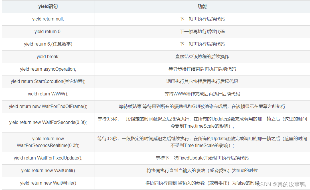 在IEnumerator类型的方法中写入需要执行的操作,遇到yield会暂时挂起,yield return后条件满足才继续执行后面的内容
