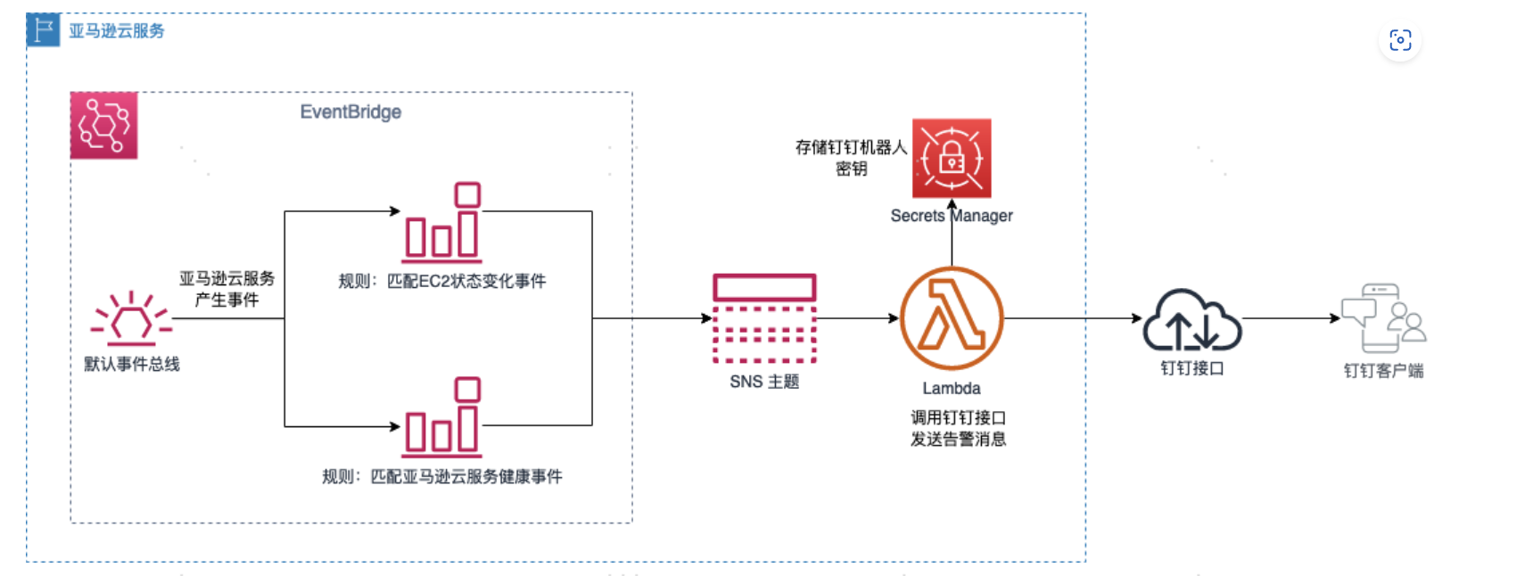 微信或钉钉等即时通信工具均提供了消息接口,第三方应用获取授权后,通过调用这些接口即可往客户端发送消息。在AWS上可以在EventBridge/Cloudwatch Event中配置事件规则,即可以触发一个Lambda运行微信/钉钉接口调用的处理逻辑。