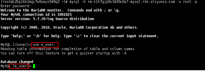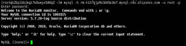[root@iZbp1bb2egi7w0ueys548qZ ~]# mysql -h rm-k1h7gjp9s3dd5c8a7.mysql.rds.aliyuncs.com -u root -p
