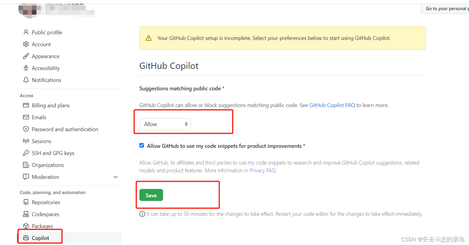 左侧菜单进入copilot,按照图片设置为ALLOW, 然后点击save保存设置