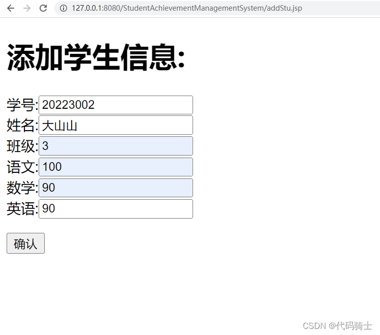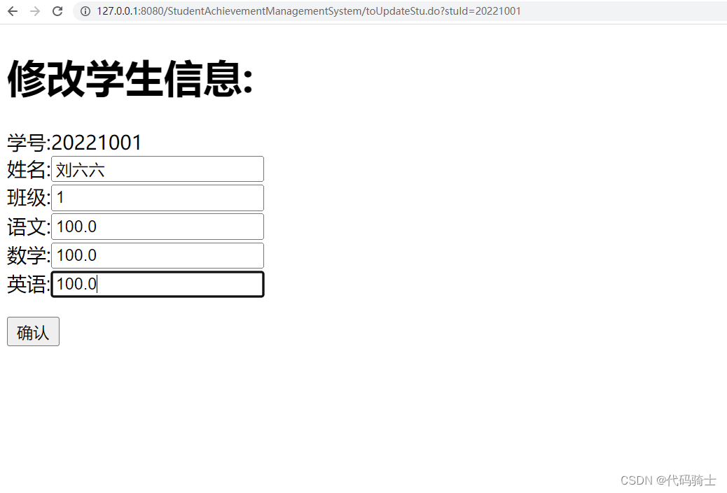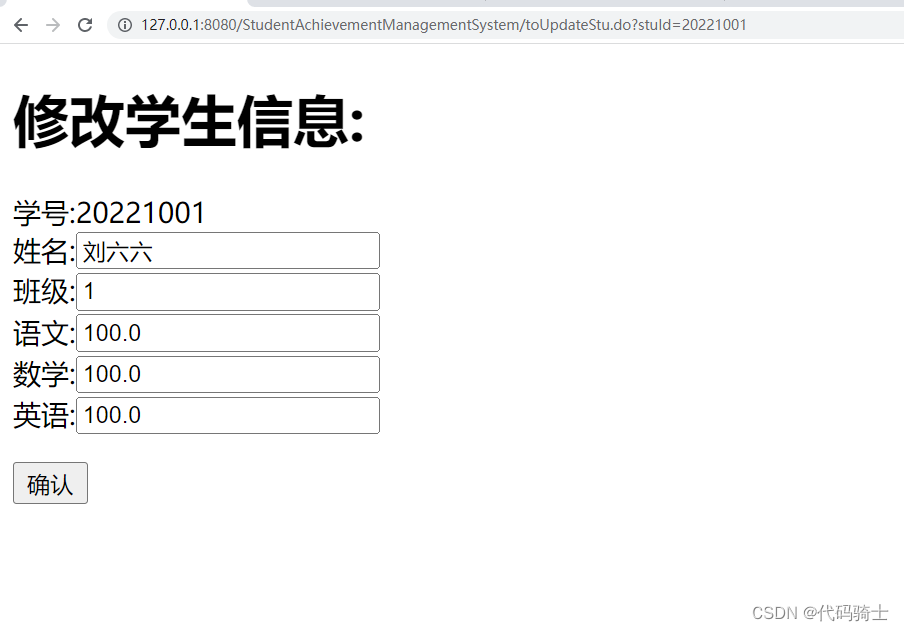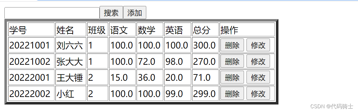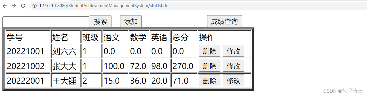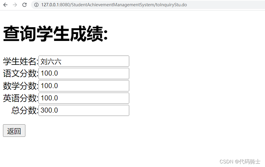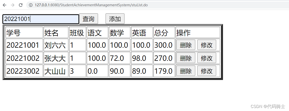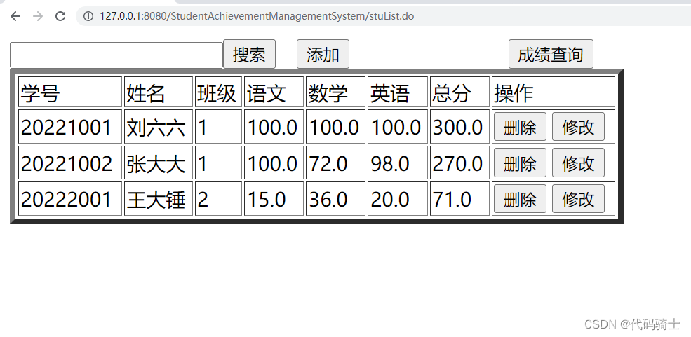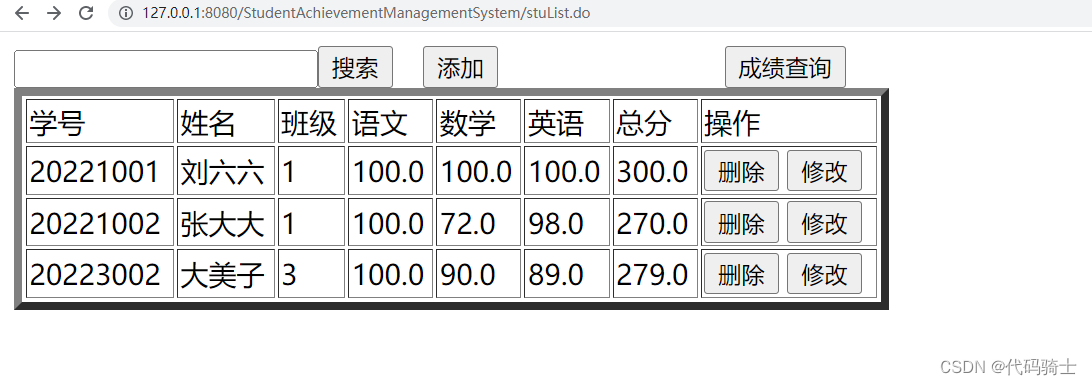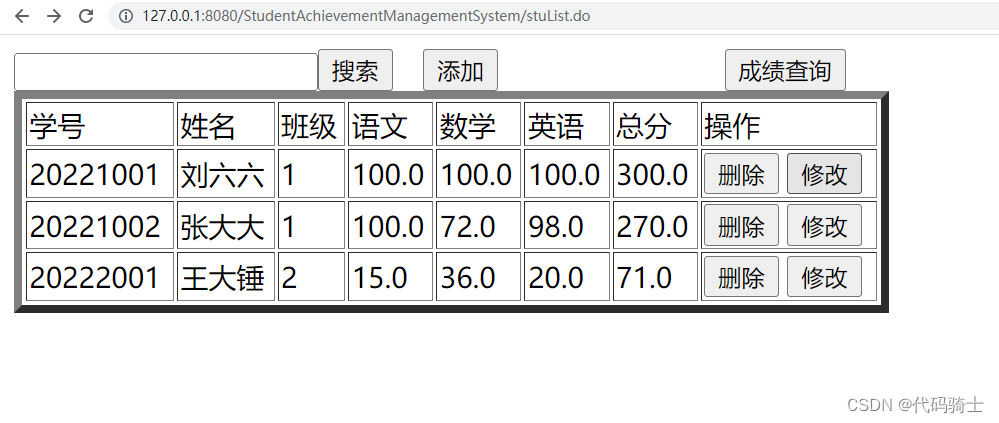 - 前端 jsp 页面把输入的学号传递给Servlet,Servlet拿着学号去业务层调方法取得数据库中的分数信息,再通过转发技术将参数返回给前端查询页面。