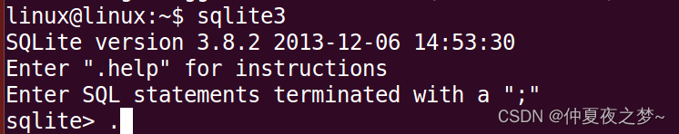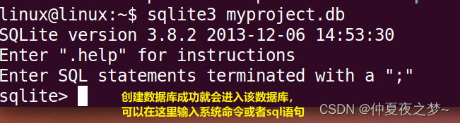 在终端输入 sudo apt-get install sqlite3 安装sqlite3,安装完毕以后,在终端输入 sqlite3 ,若出现以下内容,说明安装成功。