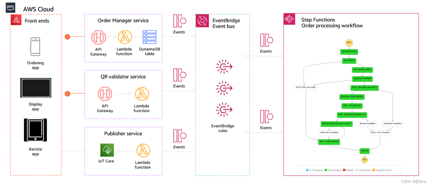 后端应用程序架构使用Amazon Step Functions、Amazon EventBridge、Amazon Lambda、Amazon API Gateway、Amazon S3、Amazon DynamoDB和Amazon Cognito。