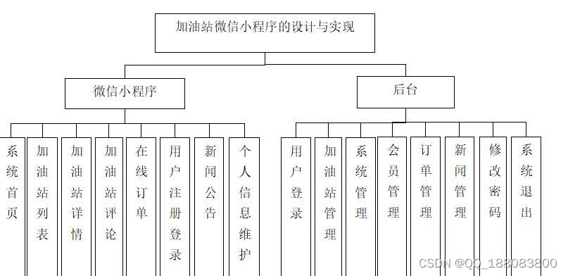完成加油站微信小程序的系统架构后,对系统的整体功能进行设计,系统从功能划分为微信小程序和后台。后台管理模块分为加油站管理、订单管理、用户管理、系统管理。微信小程序设计包括注册登录模块,加油站浏览查询,评论管理,加油站订单,个人中心。