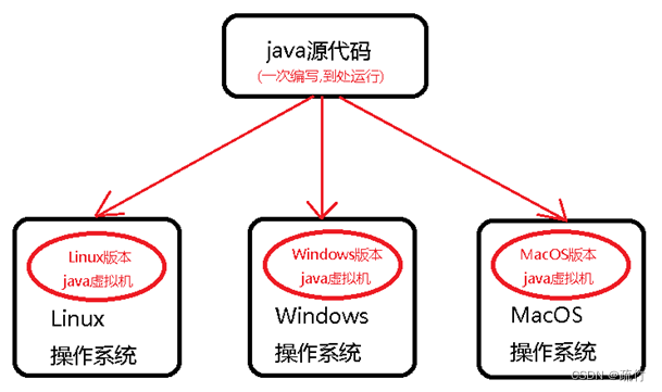 JVM:Java Virtual Machine,Java虚拟机。Java的跨平台特性表现在 Java编写软件在Windows、Linux、Mac等操作系统上都可以运行。Java能够跨平台,主要是因为在不同的操作系统上安装了对应的JVM。Java程序只能在安装了JVM的操作系统上面运行,不同的操作系统对应不同版本的JVM,一次编写处处运行。