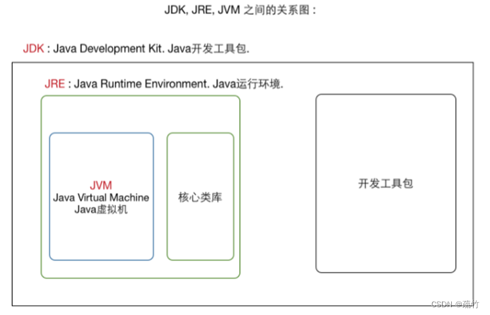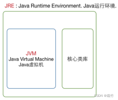 JRE:Java Runtime Environment ,Java运行环境。要运行Java程序,除了JVM,还需要程序运行必须的核心类库。JRE包含JVM和核心类库。